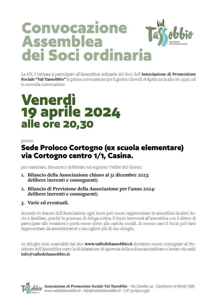 a S.V. è invitata a partecipare all’Assemblea ordinaria dei Soci dell’Associazione di Promozione Sociale “Val Tassobbio” in prima convocazione per il giorno Giovedì 18 aprile 2024 alle ore 23:30, ed in seconda convocazione